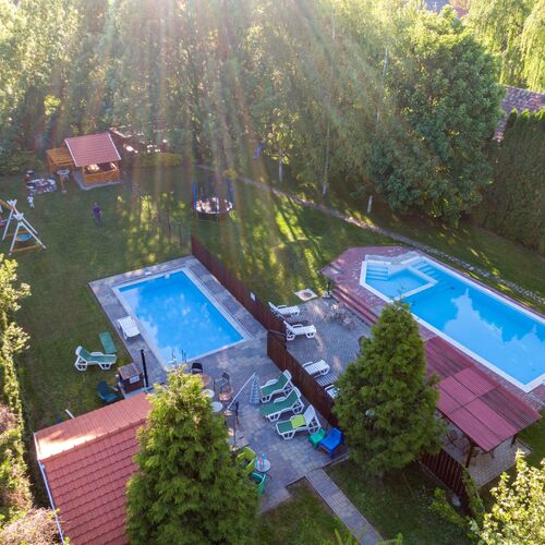 Pentru relaxarea confortabila a oaspetilor nostri va punem la dispozitie o curte peisagistica extinsa, 2 piscine exterioare, parasolare, sezlonguri, sauna, mobilier de gradina, gratar, facilitati pentru gatit, un mic teren de joaca, spatiu inchis de parcare si o bucatarie complet echipata.