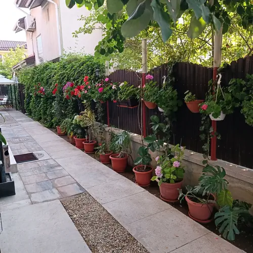 In curtea vilei va puteti bucura de liniste, verdeata si de o terasa. Terasa dispune de un bufet amenajat care poate fi utilizat doar pentru prepararea micului dejun sau a gustarilor pentru copii si se afla la dispozitia turistilor zilnic pana la orele 22.