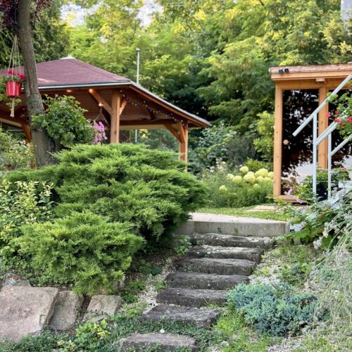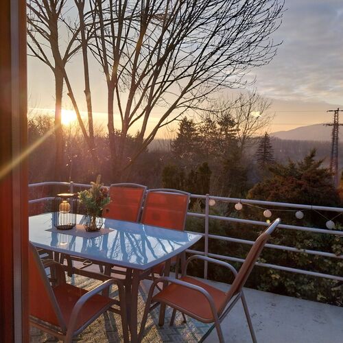 Terasa de 20 metri patrati are umbrela mare retractabila si mobilier de gradina, ofera o priveliste frumoasa spre dealurile Visegrád. O gradina frumos amenajata, posibilitati pentru gratar si gatit in aer liber ii asteapta pe stimatii nostri oaspeti.