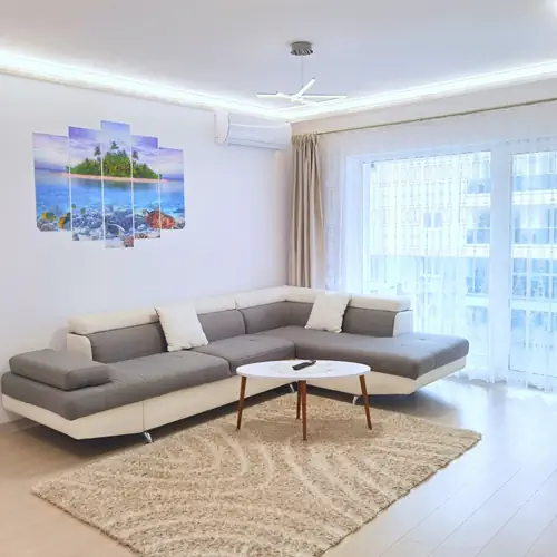 Apartamentul dispune de un living spatios frumos amenajat cu mobila si coltar extensibil, Aer Conditionat, smart TV mare, si acces pe balcon (zona de fumat), Wi-Fi disponibil gratuit in intreaga locatie.