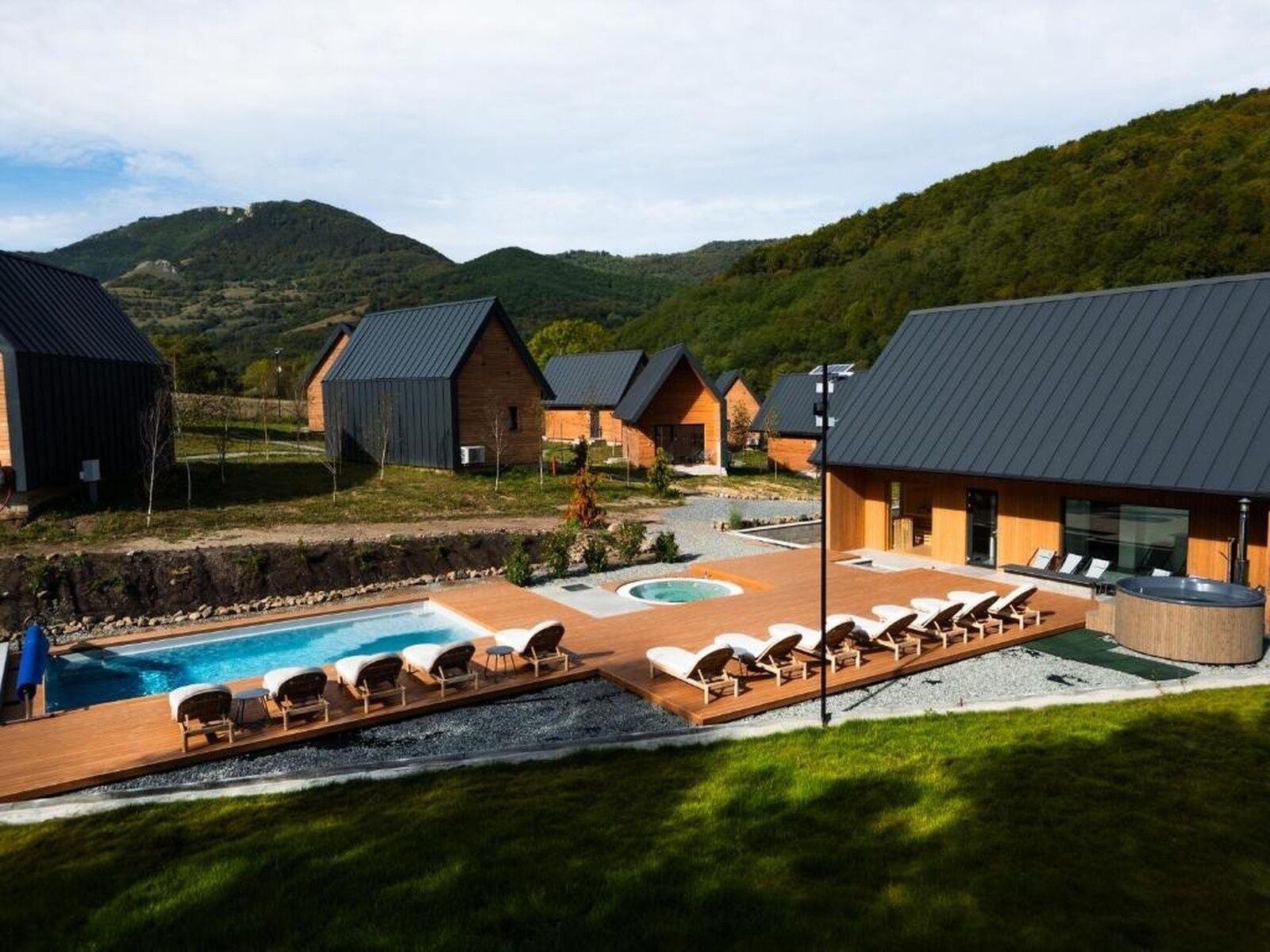 Chalet-urile cu terasă și ferestre panoramice invită la contemplare. Vara, piscina exterioară și șezlongurile din lemn sporesc senzația de relaxare. Jacuzziul completează experiența sub stele.